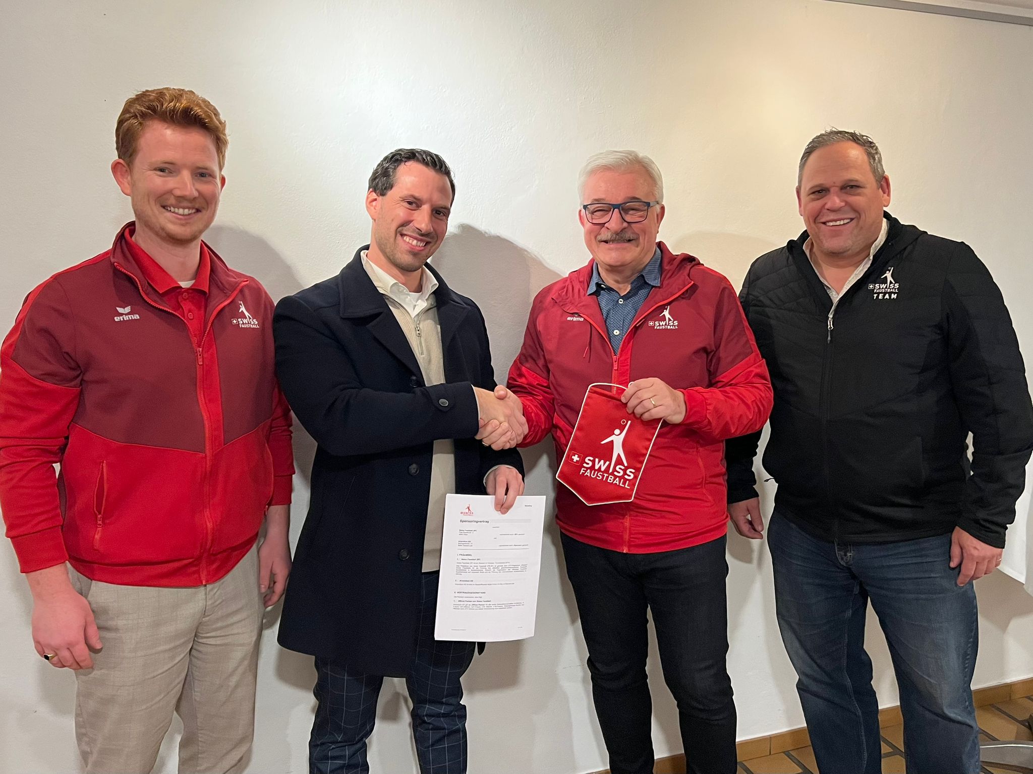 Lars Haller Marketing- und Kommunikation Swiss Faustball, Elias Paul Geschäftsführer der airproduct AG, Franco Giori Präsident Swiss Faustball und Oliver Lang Nationaltrainer Frauen