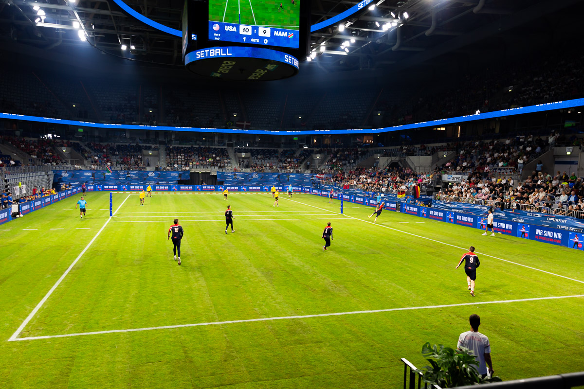 Gespielt wird in Mannheim und das an zwei verschiedenen Austragungsorten. Die Vorrunde und die Qualifikationsspiele werden im Rhein-Neckar Stadion gespielt. Die Halbfinal- und Finalpartien an den letzten beiden WM-Tagen werden erstmals in der Geschichte des Faustballsports in der Halle ausgetragen. Und zwar nicht in irgendeiner Halle sondern in der SAP-Arena, die Platz bietet für 15'000 Zuschauerinnen und Zuschauer. Gespielt wird aber natürlich nicht auf dem Hallenboden sondern trotzdem auf Rasen. Dafür wird ein Natur-Rollrasen verlegt – eine Premiere, auf die wir sehr gespannt sind.